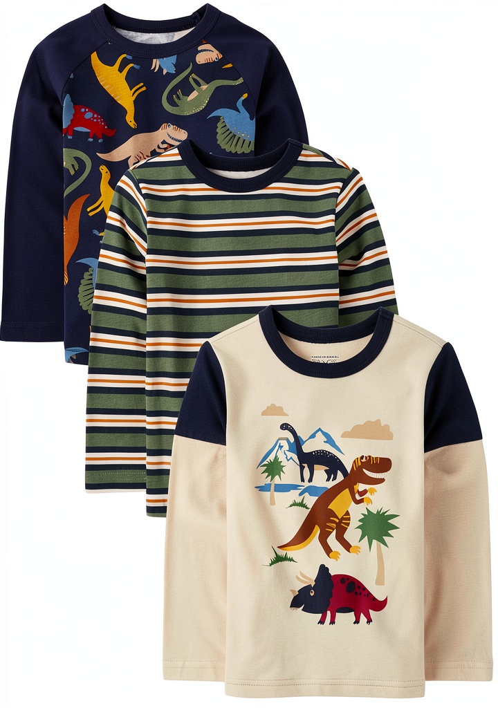 These versatile baby boys’ tees are ideal for everyday activities, from daycare and preschool to family outings and casual playdates. The comfortable cotton-polyester blend makes them suitable for all seasons, providing breathability in warmer weather while the long sleeves offer light coverage during cooler months. The dinosaur-themed designs appeal to young children’s interests while the practical 3-pack format ensures parents have multiple outfit options ready. These shirts work well as standalone tops or as layering pieces under jackets and sweaters.